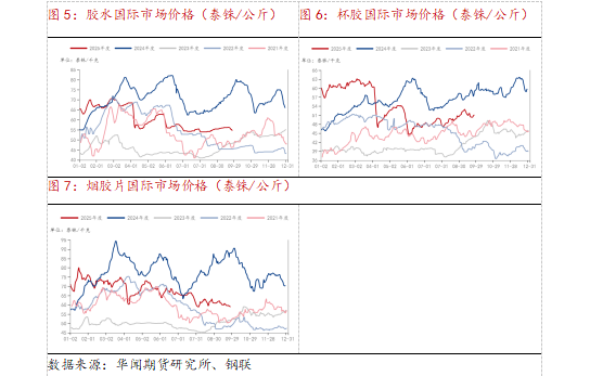 钢联数据显示,至9月26日,主要原料价格FOB报价,泰国胶水54.8泰铢/公斤、杯胶51.05泰铢/公斤、烟胶片为58.88泰铢/公斤,环比上月底分别减少0.65泰铢/公斤、增加0.55泰铢/公斤和减少2.2泰铢/公斤。9月国内外主产区处于年内的极端天气高发季,原料价格维持坚挺。但今年天气扰动对原料产区的影响小于去年,原料价格低于去年同期,高于往年同期水平。10月台风季过去,预计橡胶逐渐上量,原料价格预计下行。