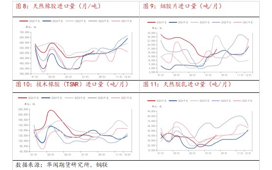 据钢联最新数据显示,2025年8月中国天然橡胶(含技术分类、胶乳、烟胶片、初级形状、混合胶、复合胶)进口量52.08万吨,环比增加9.68%,同比增加5.39%,2025年1-8月累计进口数量412.14万吨,累计同比增加21.82%。海外工厂前期集中发货订单仍陆续到港中,叠加云南替代种植指标进入,中国进口环比小幅增量。其中,泰国、越南和老挝进口量位居前三,其中泰国进口量18.5万吨,环比减少2.72%。