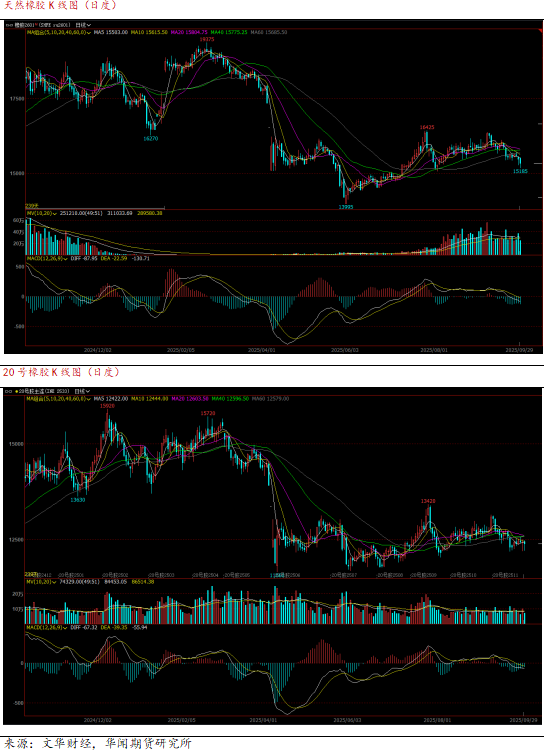 9月天然橡胶主力合约呈震荡走势,盘面主力合约收跌。国内外主产区处于割胶季,产量预期上量,但持续降雨使得原料价格处于同期高位,对胶价有一定支撑。9月下旬公布的我国天然橡胶进口量环同比增加,略超市场预期。东南亚主产区降雨频繁,但极端天气少于去年同期。需求方面,9月轮胎企业开工率较8月有所回升,但在国外关税政策扰动下,需求端不确定性依然较强,市场氛围较谨慎。至9月29日上午,沪胶主力合约收跌3.37%,20号胶收跌2.44%。