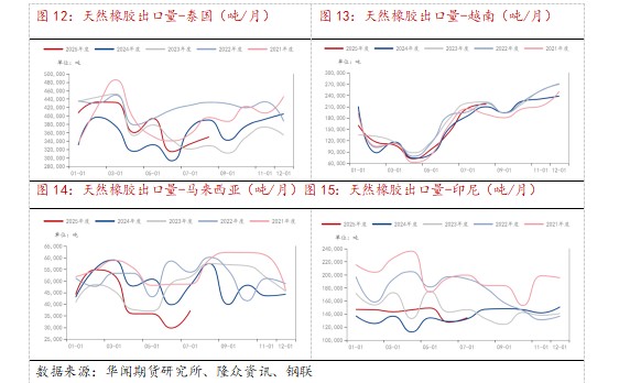 越南7月越南天然橡胶出口量在21.66万吨,较上月增加1.05万吨,环比上涨5.09%,同比上涨3.30%,1-8月越南天然橡胶累计出口111.98万吨,累计同比下滑0.15%。其中,8月出口至中国15.87万吨,呈现小幅增长,产区雨水扰动增加,原料供应受限,成本端支撑较强,8月中国上海市场越南3L均价为14826.19元/吨,环比25年7月份上涨0.93%。一方面,9-10月处于季节性上量时期,另一方面,越南10号胶和3L胶现货价格处于同期高位水平,存在出口利润,预计9月出口量有小幅上涨。