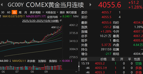 数据显示,国庆期间,COMEX黄金的价格不断创出新高。10月8日,COMEX黄金的价格盘中一度突破4060美元/盎司关口。