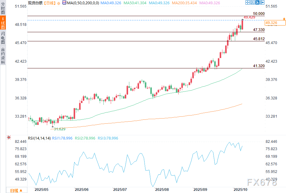 汇通财经APP讯——周三(10月8日)美盘时段,随着交易员判断近期涨势是由实际需求推动,还是受黄金创纪录涨势的动能传导影响,白银价格正逼近关键阻力位。在触及49.81美元后,白银开始冲击50.00美元这一关键心理关口——该价位已逾十年未被测试。