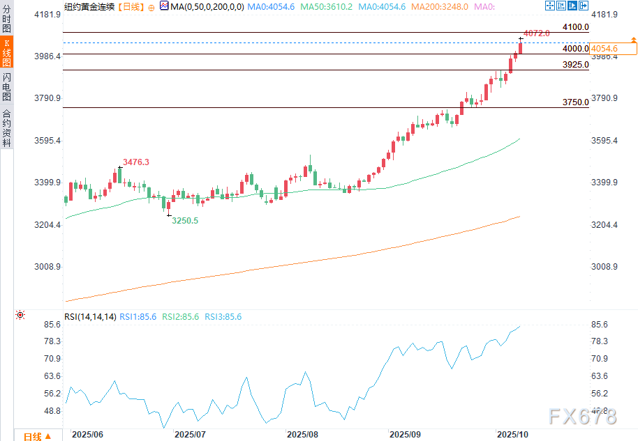 从技术面来看,12月黄金期货多头在近期整体技术面中占据明显优势。多头的下一个上行目标是推动期货收盘价突破4100.00美元的关键阻力位。空头的近期下行目标则是将期货价格打压至3850.00美元的关键技术支撑位下方。第一阻力位见于今日创下的4071.50美元历史高点,进一步阻力位在4100.00美元;第一支撑位见于隔夜低点4005.60美元,进一步支撑位在4000.00美元。