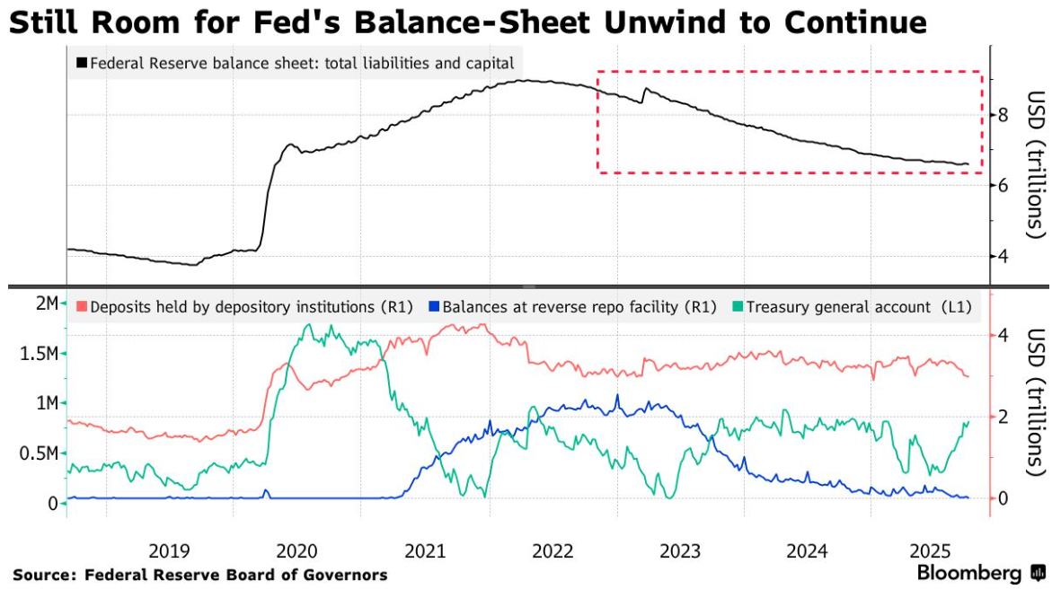 自2022年以来,美联储官员一直在缩减央行资产负债表——这一过程被称为量化紧缩——逆转了疫情爆发后为刺激经济而进行的数万亿美元资产购买。今年早些时候,美联储通过减少每月到期债券的滚续规模来放慢缩表步伐。