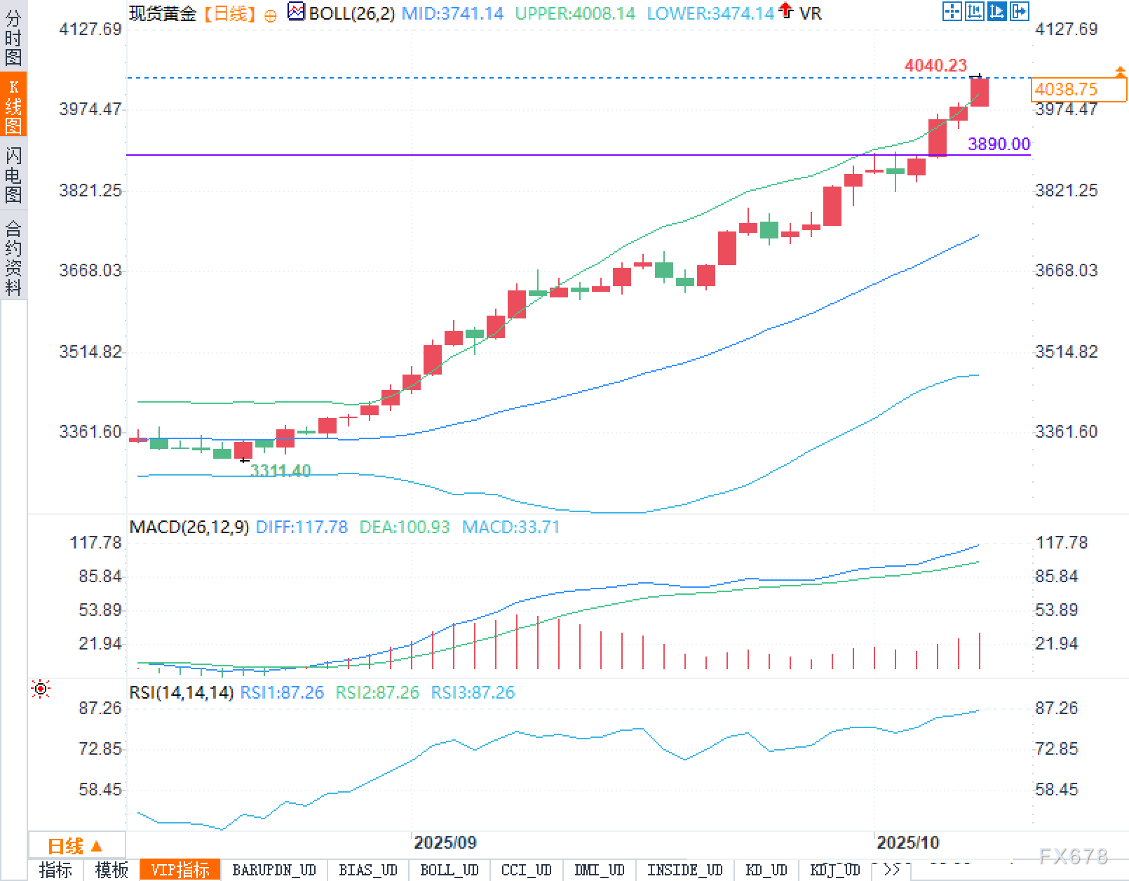 从日线图观察,布林带开口走阔,中轨3741.14、上轨4008.14、下轨3474.14。现价已强势越过上轨,典型的“沿轨奔跑”态势,显示趋势强度极高。横向关键位方面,3890.00为前期阻力转支撑的“新台阶”,近期连续阳线的实体较饱满,上影线较短,说明抛压有限且动量延续。