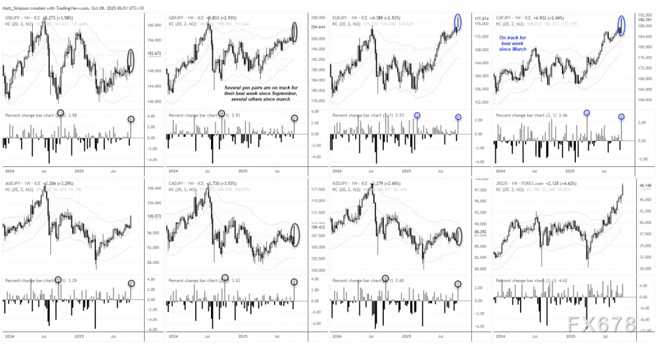 汇通财经APP讯——本周日元已成为空头最青睐的标,因一位主张强力刺激的候选人在日本首相角逐中领先。日元交叉汇率全线飙升,美元空头回补推动美元兑日元本周累计上涨3.6%。周四(10月9日)亚市时段,美元兑日元未延续前五个交易日涨势,现于152.55附近震荡。