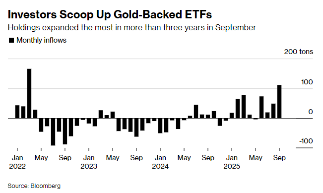 随着投资者在美国政府资金僵局后寻求规避潜在市场冲击,金价的飙升显得尤为紧迫。美联储货币政策宽松周期的开启,也为无息资产黄金带来利好。在此背景下,投资者纷纷涌入黄金ETF,9月黄金ETF录得逾三年来最大单月资金流入。