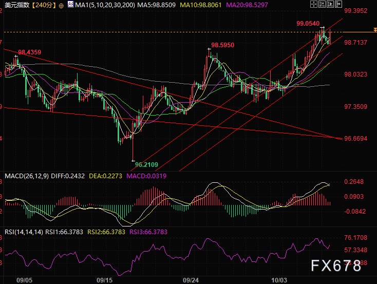 汇通财经APP讯——周四(10月9日)亚欧时段美元指数继续上涨,目前涨0.16%,交投于98.99附近。美元指数自96.21后大幅反弹,这次又已经走出四连阳,但其实市场上并没有太多利好美国的数据发布。