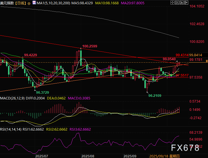 尽管原因不同,但美元与黄金均受益于当前全球共同的不安情绪。美元指数(DXY)已攀升至接近99.00的水平,其支撑因素更多来自全球局势的脆弱性,而非美国国内的乐观情绪。