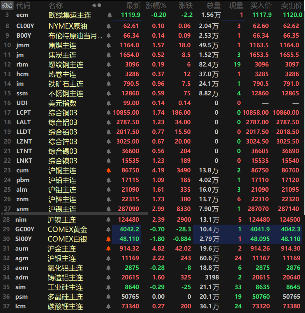 此外,碳酸锂主连涨0.27%,工业硅主连跌0.29%,多晶硅主连收平于50765元/吨。欧线集运主连跌0.2%报1119.9。