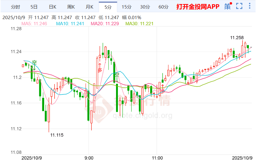 今日周四(10月9日)亚盘时段,纸白银目前交投于11.221一线上方,今日开盘于11.321元/克,截至发稿,纸白银暂报11.243元/克,下跌0.71%,最高触及11.353元/克,最低下探11.115元/克,目前来看,纸白银盘内短线偏向看涨走势。