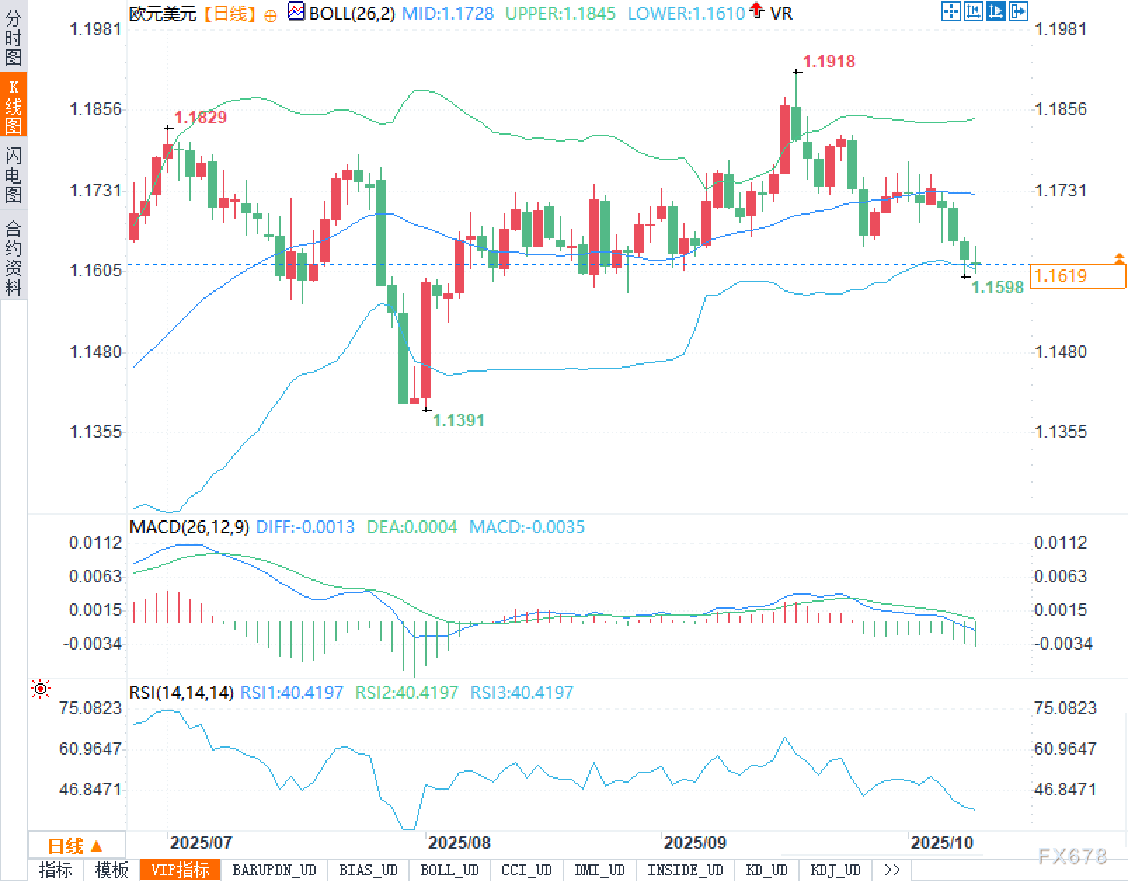 汇通财经APP讯——周四(10月9日)欧洲时段,欧元兑美元延续此前三日的弱势,现交投于1.16上方。汇价自周内高位回撤后持续承压,近端技术结构尚未出现反转信号,短线风险倾向仍偏向下行。基本面层面,美元在谨慎情绪中获支撑,欧元则受欧洲内部不确定性与政策前景摇摆的双重挤压。