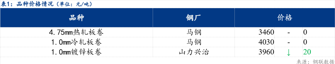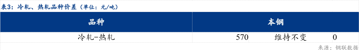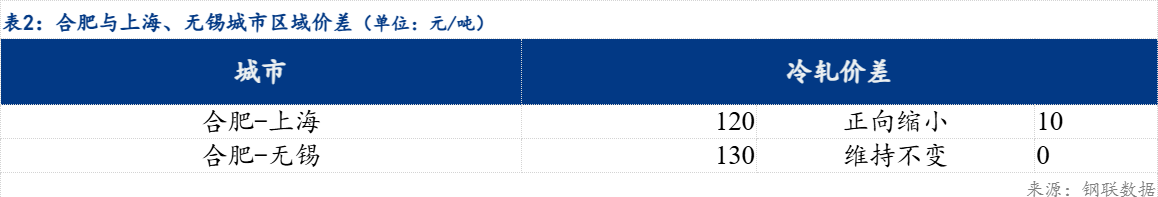 今日合肥-上海1.0mm马钢价差为120元/吨,较上一交易日收窄10元/吨;合肥-无锡1.0mm马钢价差为130元/吨,较上一交易日持平 ;品种价差方面:冷热价差570元/吨,较上一交易日持平 。