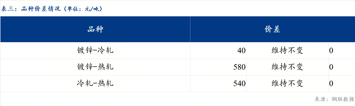 品种价差来看,现镀冷价差为40元/吨,较上一交易日维持不变;镀热价差为580元/吨,较上一交易日维持不变;冷热价差为540元/吨,较上一交易日维持不变。