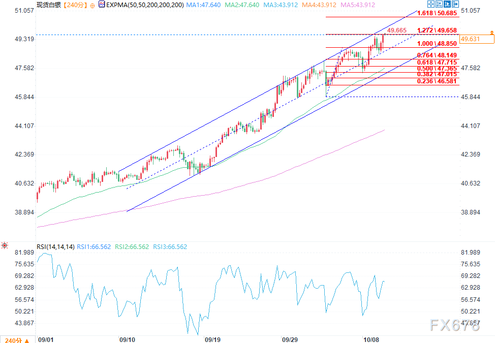 周四早盘,白银从48.40美元反弹,已触及49.70区域,多头正瞄准50.00美元关口,该位置是自9月中旬低点以来上升通道的上沿与价格的交汇点。进一步上方,10月初涨势的161.8%斐波那契扩展位在50.70美元。