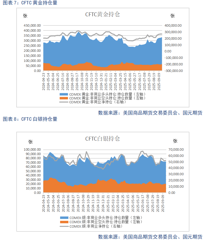 截至9月27日的周度统计周期中,黄金非商业多头持仓为332808张,较上周增长6030张,非商业空头持仓为66059张,较上周增加了5691张,基金净持仓增加339张,多头进场,空头离场,多头持仓变化更大。截至9月27日的周度统计周期中,白银非商业多头持仓为72318张,较上周增加了695张,非商业空头持仓为20042张,较上周减少43张,基金净持仓增加了738张,多头进场,空头离场,多头持仓变化更大。