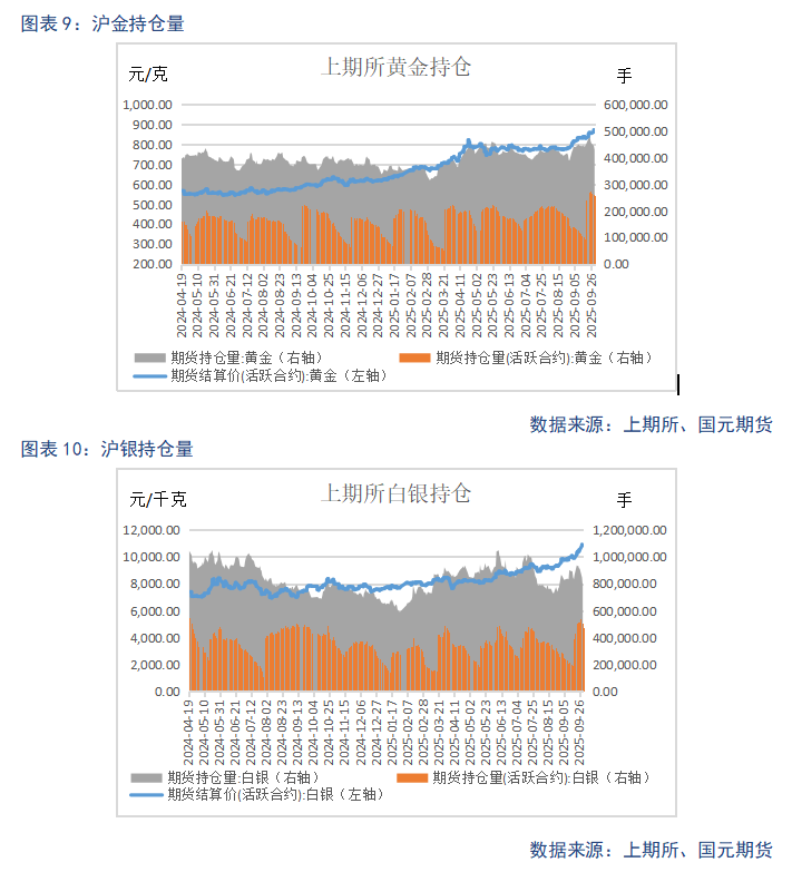 截至9月30日当周,沪金主力期货持仓量为256876手,较上周减少14678手;沪银主力期货持仓量为476244手,较上周减少32511手。