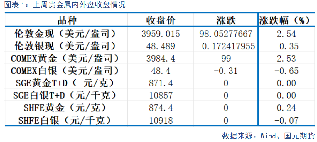 本周贵金属市场全线上涨,外盘伦敦金银分别涨2.54%和跌0.35%,COMEX金银涨2.53%和跌0.65%;内盘SGE金银T+D无变动,SHFE金银涨0.24%和跌0.07%,市场看多情绪较浓。