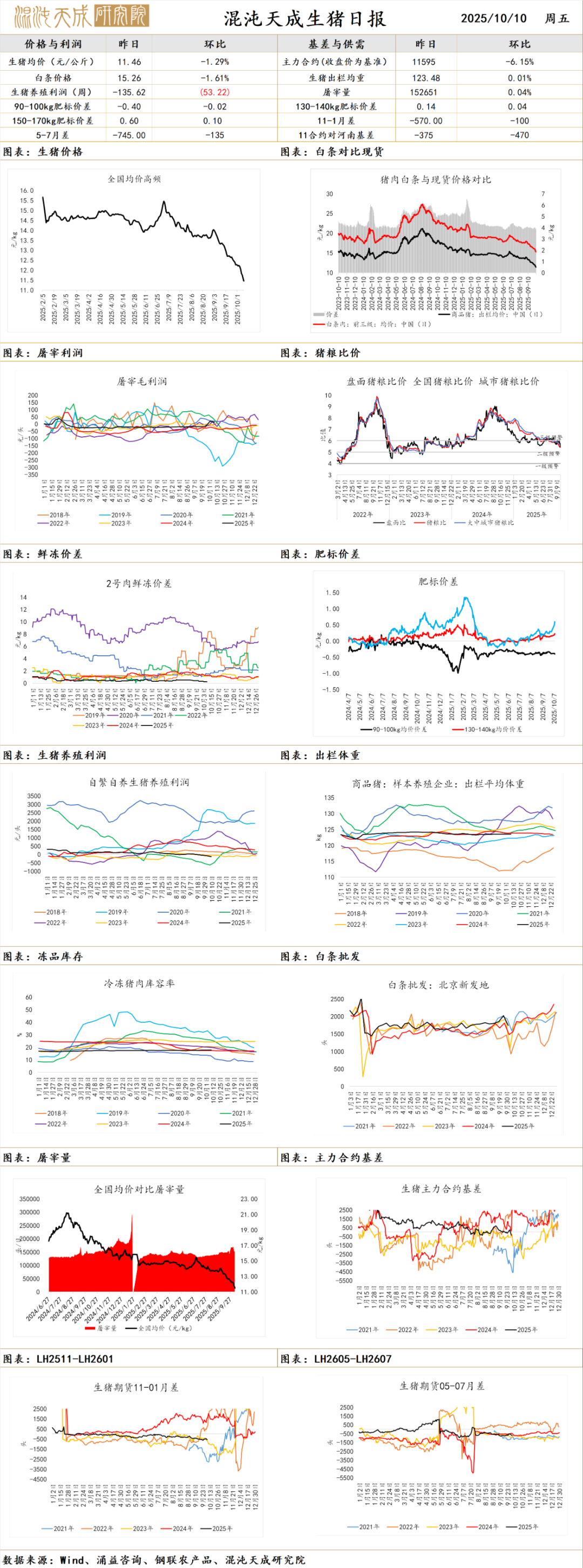 现货方面,昨日现货报价11.46元/kg,假期期间环比下跌环比-6.67%;LH2511主力合约报价11595元/吨,环比-6.15%。
