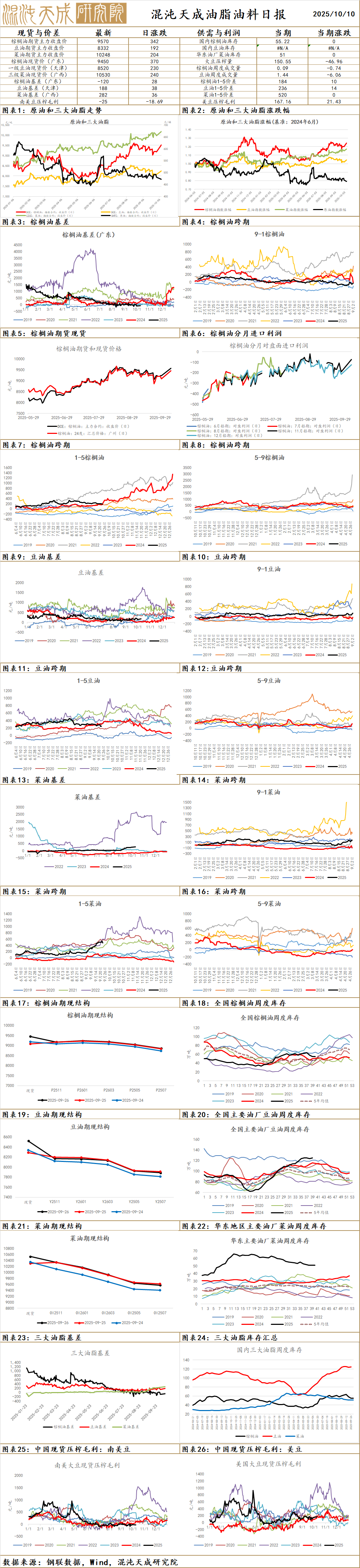 供给端:路透调查显示,预计马来西亚2025年9月棕榈油库存为215万吨,比8月下降2.5%,为七个月来首次下滑;产量预计为179万吨,比8月下降3.3%,触及6月以来的最低水平;出口量预计为143万吨,比8月增长7.7%;马来西亚棕榈油协会(MPOA)发布的数据,马来西亚9月1-30日棕榈油产量预估减少2.35%,其中马来半岛减少6.17%,沙巴增加2.35%,沙捞越增加6.62%,东马来西亚增加3.44%,预估9月马来西亚棕榈油总产量为181万吨;印度尼西亚(Gapki)的数据:印尼7月棕榈油产量6月的528.9万吨上升至560.6万吨,出口量从6月份的360.6万吨下降至353.7万吨,库存从6月的253万吨上升至256.8万吨;马来西亚棕榈油局(MPOB)公布了马棕8月数据:8月马棕产量185.5万吨,环比增加2.35%,出口132.5万吨,环比减少0.29%,机构预估出口145万吨,实际公布的出口量小于预期,月马棕表需49万吨,几乎是单月最高表需,最终马棕库存220.25万吨,环比增加4.18%,和预期一致;印尼林业小组计划从9月1日起,对约427万公顷(1.055万英亩)林区内未获得许可运营的矿山进行打击,工作小组已经于3月启动了所谓的“纪律行动”,打击非法棕榈油生产,并派遣军方人员接管了逾330万公顷种植园。