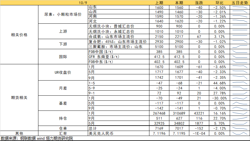 华中华北东北等地区国庆期间持续大雨,下游农业秋季玉米收割以及小麦种植进度受阻,工业尿素采购也受到影响。而中农、中化不买不卖,氮储也仍待指示。整体国庆期间流向较差,库存144.39万,高位累库,较上周增加21.22万吨,环比增加17.23%。出口方面,节间海外印标虽如预期般再次提起,但出口政策后续未有官方消息,提振不足。今日尿素现货市场主流部分出厂价格跌至1500元/吨附近较低水平,或暂时弱稳,但若继续缺乏实际利好消息,市场价格仍有松动可能,尿素盘面继续受到现实弱供需拖累,低位盘整,01合约1600的关口有破位可能性,但操作上不建议过度追空,重点关注10月中旬的出口法检政策动向和淡储节奏。