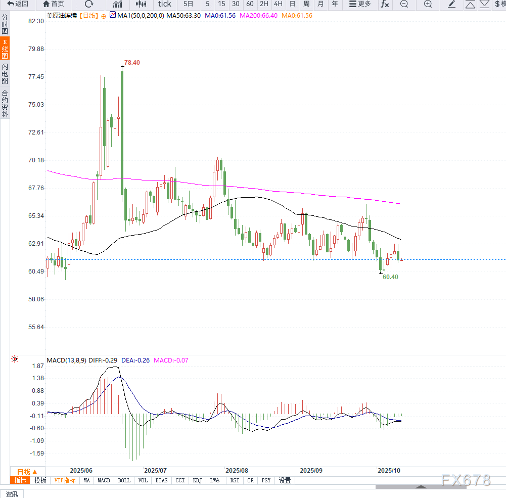 从技术图形来看,WTI日线显示价格自9月中旬高点67.40美元/桶以来持续走低,目前运行在61美元支撑区间附近。K线形态连续收出小阴线,反映出市场在低位震荡整理,买盘意愿不足。