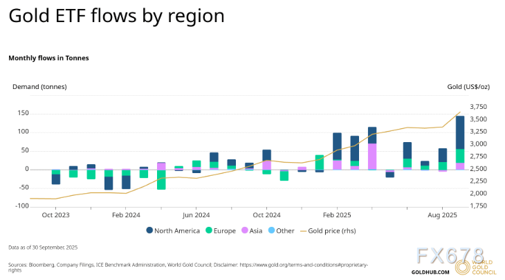 此外,资金从债券转向黄金的趋势也体现在ETF流入量上——自五月以来该数值已显著攀升。九月全球黄金采购量接近150吨,创下年内迄今最高纪录,这表明主要由债券收益率走弱推动的黄金需求依然坚实且持续。
