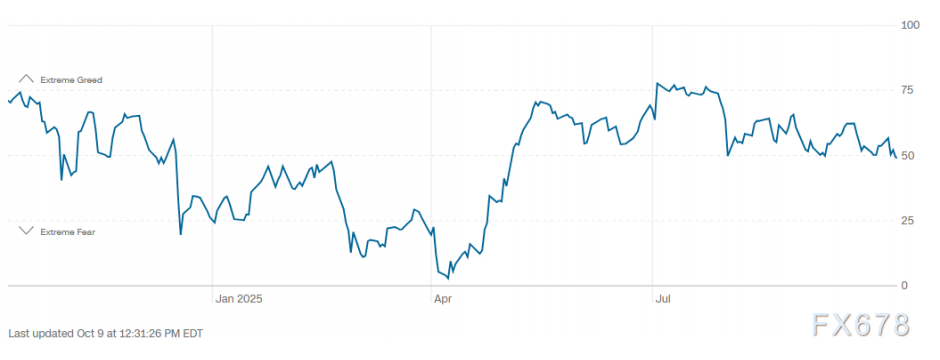 当前持续的美国政府停摆事件,引发了人们对政治和体制风险的担忧,略微挫伤了市场信心。这一影响可以在“恐惧与贪婪指数”中观察到:市场情绪已呈现稳定的下降趋势,正逼近50点水平,逐渐接近“恐惧”区间。