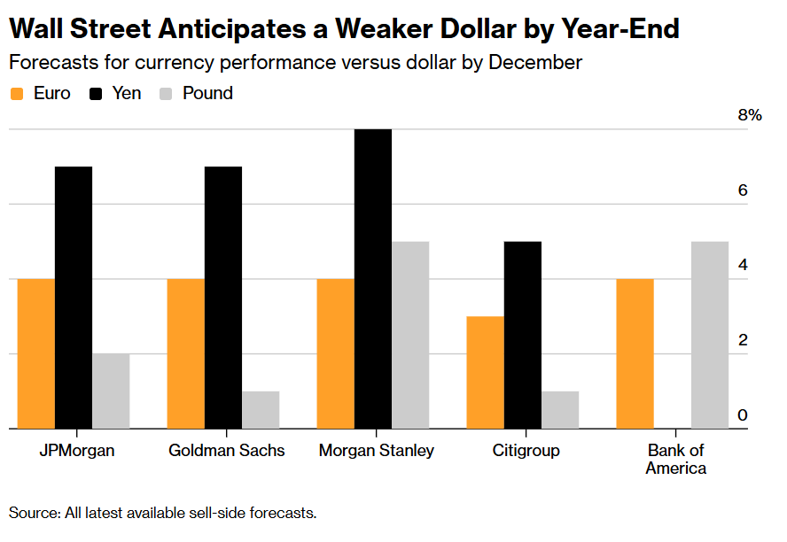 华尔街机构们普遍预计年底前美元走弱——截至12月对主要货币兑美元表现的预测