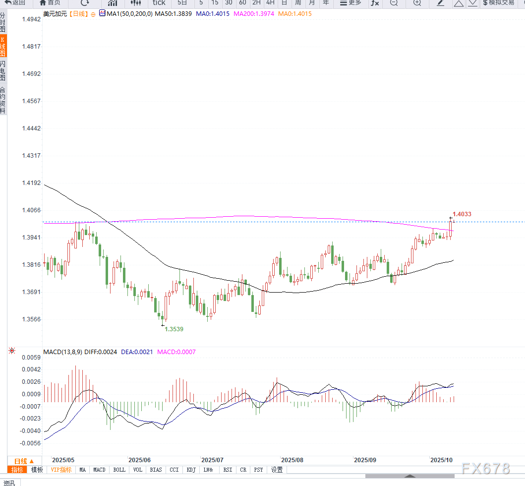 然而,若后续美国消费者数据疲软或美联储加速降息进程,美元上行动能或将受限。中期来看,1.4000关口仍是关键支撑区域,需警惕油价反弹对加元的潜在提振作用。
