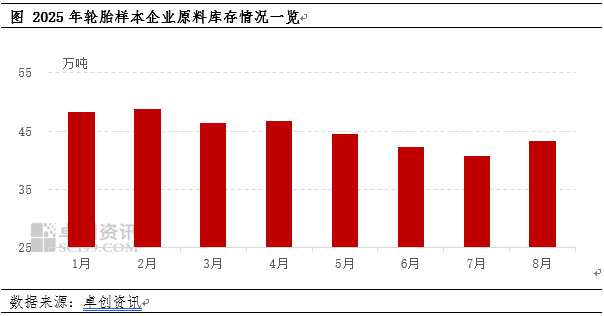据卓创资讯了解,上半年下游轮胎样本企业原料库存整体处于下降阶段,一方面在于4月份受中美对等关税冲击,市场对于全球需求总体量收缩预期升温;叠加物流运输业不景气,导致轮胎替换市场需求下降,同时轮胎企业新订单预期走弱,使企业对未来消费能力产生担忧且对于未来原料价格预期持看跌预期,因此在买涨不买跌背景下放慢生产节奏,消耗现有库存,从而使得整个原料库存储备整体呈现震荡走弱趋势。然而随着企业原料库存的持续下滑,整体库存储备处于低位。但同时终端市场来看,下半年我国重卡保持稳健增长,物流景气度回升等,传导至轮胎企业订单保持较强韧性;同时由于原料供应上量不足,胶价向下运行空间有限,因此轮胎企业逢低补货积极性升温,原料库存8月呈现较明显增长,且9月份因国庆节前备货支撑,预计仍将维持上涨趋势。而这也将导致在国庆节后短期来看,原料库存储备充分,以及四季度下游订单淡季影响下,整体原料采购需求提升空间或有限。