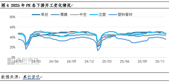 HDPE:2025年四季度HDPE装置检修处于年度低位,2025年7-8月份是检修高峰,9月之后检修计划开始减少,产量同比增幅或有所收窄,但绝对值仍维持高位。2025年四季度,随着新投产能持续释放,尤其HDPE通用料产能增加,市场供过于求现象尤为明显,加之四季度为传统需求淡季,市场消化原料速度放缓,企业或存一定检修计划,但预计不会出现大规模集中检修情况。