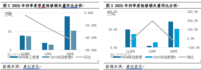 据卓创资讯数据统计 预计2025年四季度LDPE检修损失量在14.5万吨,同比增加196.5 %,环比下降25%; LLDPE检修损失量在37.5万吨,同比下降25.3%,环比下降3.77%;HDPE检修损失量在52万吨,同比下降28%,环比下降42%。