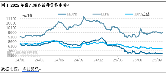 2025年三季度,聚乙烯价格延续跌势。截至2025年9月26日,LLDPE均价7331.78元/吨,同比下跌11.87%,环比下跌1.65%;LDPE均价9552.78元/吨,同比下跌7.29%,环比上涨2.38%;HDPE拉丝均价7860.12元/吨,同比下跌2.24%,环比下跌1.85%。