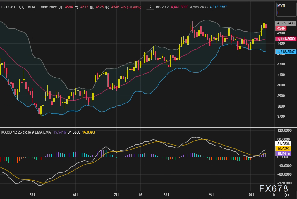 汇通财经APP讯——周五(10月10日),马来西亚衍生品交易所棕榈油主力合约收于4546林吉特/吨,单日下跌0.98%,但本周累计涨幅达2.34%,实现连续两周上行。盘中价格在技术指标区间内震荡,布林带中轨位于4565林吉特附近,MACD柱状线收窄至16.04,显示多空力量处于胶着状态。