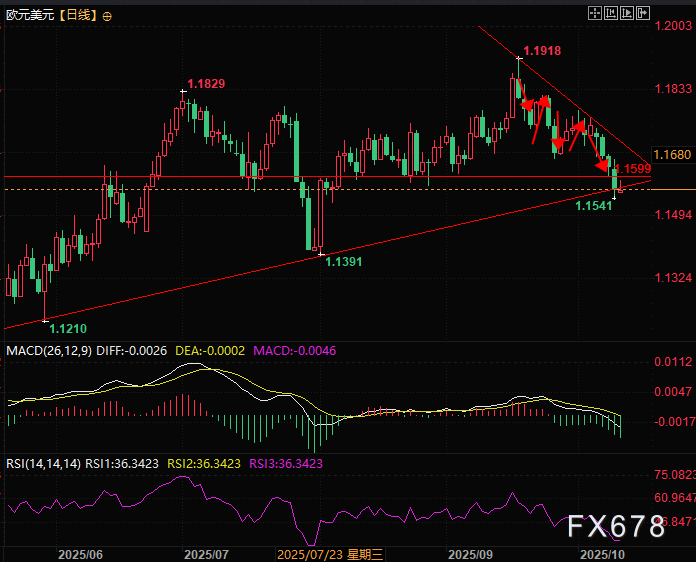 欧元进一步跌穿了1.1600这个全市场都在看的关键价位,技术派多头这里可能会选择止损放弃抵抗,同时空头得到了宣泄,目前在上升趋势线附近止跌,开始酝酿反弹,日线完成了5波完整的下跌。