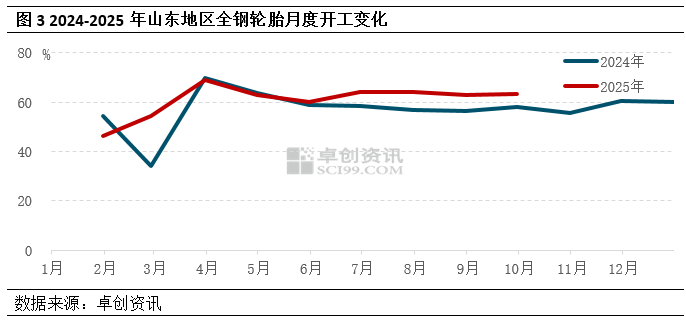 需求方面:9月山东地区轮胎企业全钢胎平均开工负荷为63.39%,较上月开工走高0.55个百分点。本月山东地区全钢轮胎开工维持小幅调整变化,月内开工主要表现有:一是从了解来看,月内全钢轮胎综合订单表现尚可,特别是出口订单同比有一定增加,对轮胎开工支撑较强,但是开工新增尚存一定压力,更多维持小幅调整变化。二是考虑国庆假期有一定检修安排,部分厂家在下半月有提前赶工行为,叠加月内生产外部保障性较好,开工运行状态较上月有向好改善。整体来看,在需求支撑下全钢轮胎厂家开工更多延续稳定,虽然月底部分企业计划启动国庆检修,但是开工下行拖累更多将从次周开始体现。