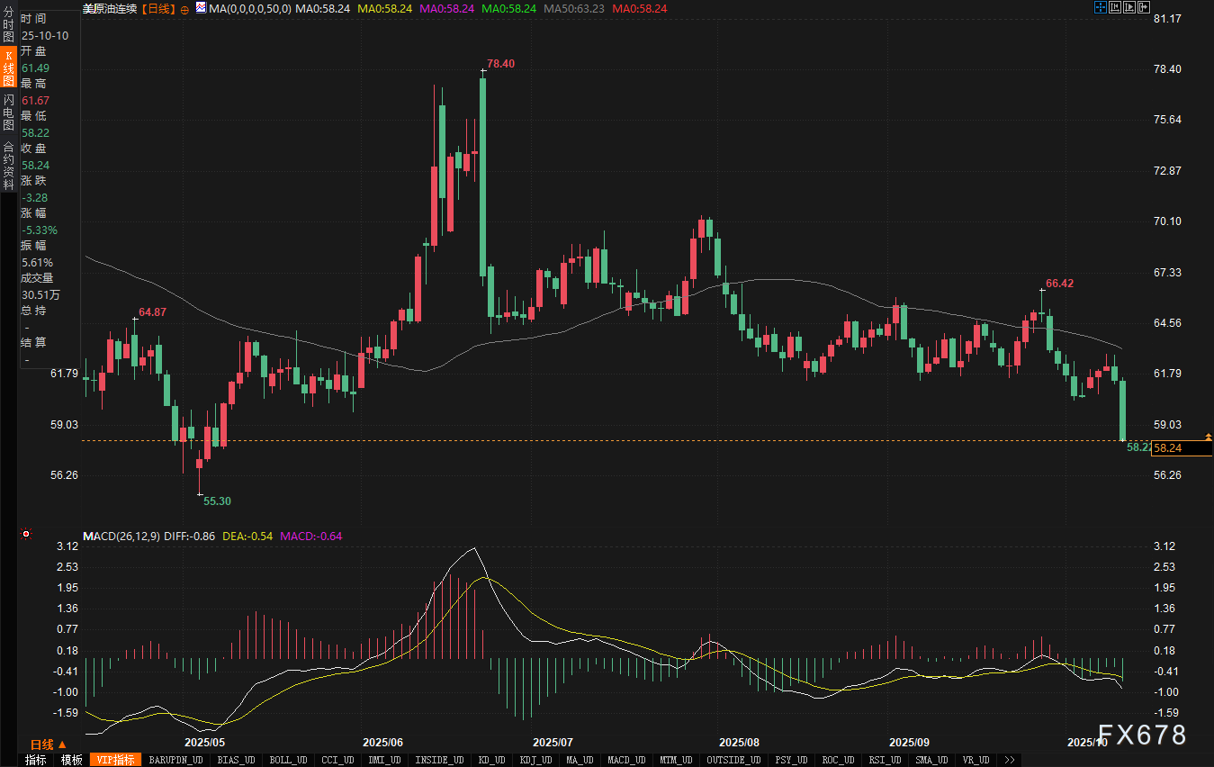 美原油连续合约(WTI)的跌势更为凶猛,体现了北美市场对于短期需求的悲观预期。WTI合约周五重挫5.33%,收盘报每桶61.52美元。盘中,WTI价格一度跌破重要的60美元心理关口,最低触及每桶58.22美元,显示出市场恐慌情绪的蔓延和多头仓位的快速解除。
