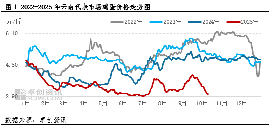 【导语】产能高位前提下,云南鸡蛋价格同比走低。节后消费进入传统淡季,终端走货疲软,3元/斤的阶段性低点虽引发短期补货,但提振有限。供大于求矛盾加剧,预计10月云南均价或延续三季度颓势。