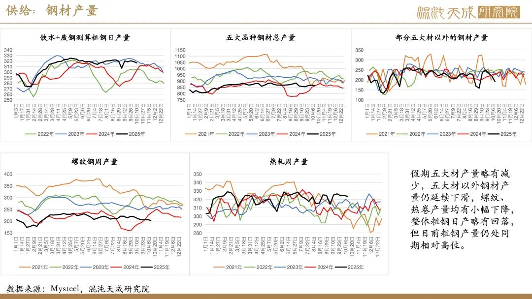 供给:假期全球铁矿发运有小幅回落,主要是澳洲及非主流发运减量,巴西发运略有回升,但因前期高发运,国内铁矿到港仍有增长。同期,国内矿产量变化不大,但废钢到货因假期影响有明显减少,整体铁元素供应略偏弱。由于废钢日耗及铁水均有减量,假期粗钢供应小幅减少。