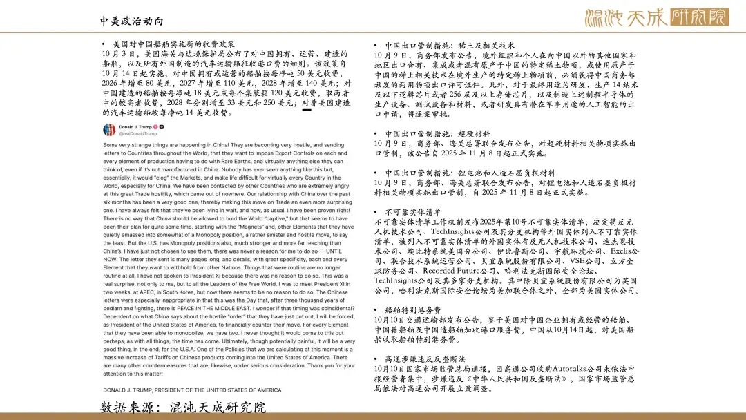 海外宏观:本周逻辑的变盘点是周五美盘时间,主要受到特朗普言论以及中美政治动向的干扰为主;其次美元流动性也是关键因素,美股的走势在周五夜盘出现明显回落,主要源于特朗普的言论事件,这一定程度形成负反馈从而加深市场压力;同时美国银行准备金自1月1日以来首次跌破3万亿美元,其占商业银行总资产的比例下降至12.18%,低于13%的阈值,这一数据反映了当前美国银行体系流动性边际趋紧的状态;美联储隔夜逆回购下降至41亿美元,续创2021年4月份以来新低,这也显示出市场对于风险处理的储备资金明显不足;这是对流动性的考验。美国政府关门和经济数据仍不能摆脱“滞涨”风险,10月议息会议前,市场的降息预期仍存在高波动的可能。