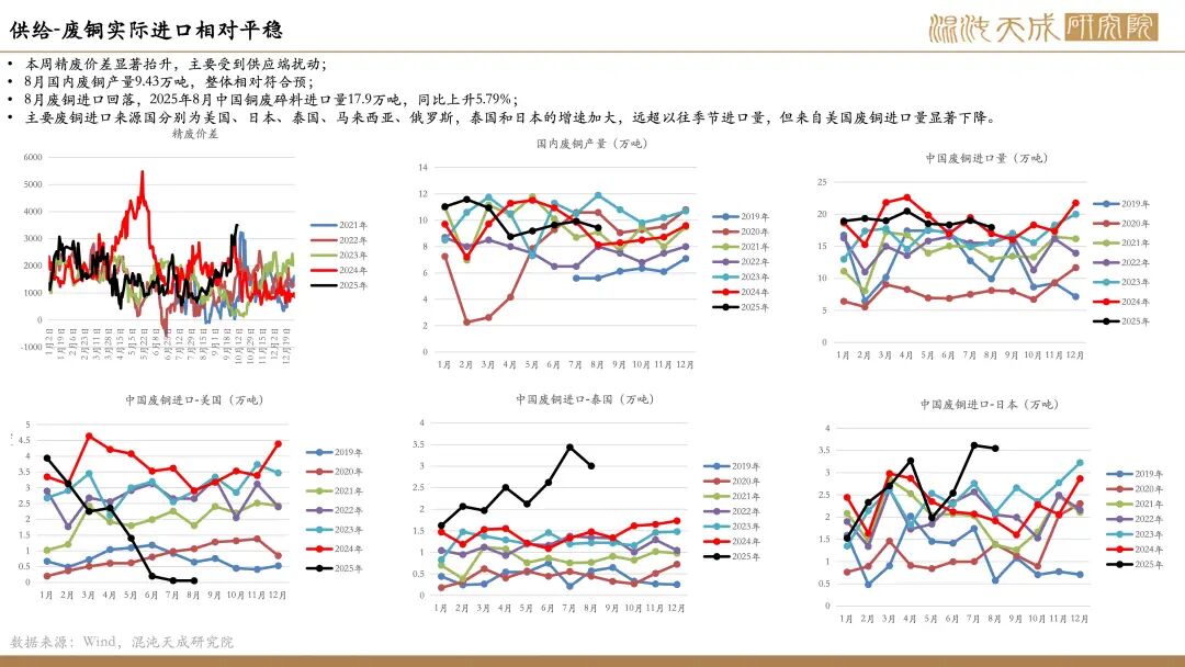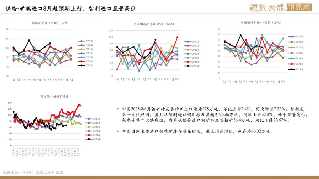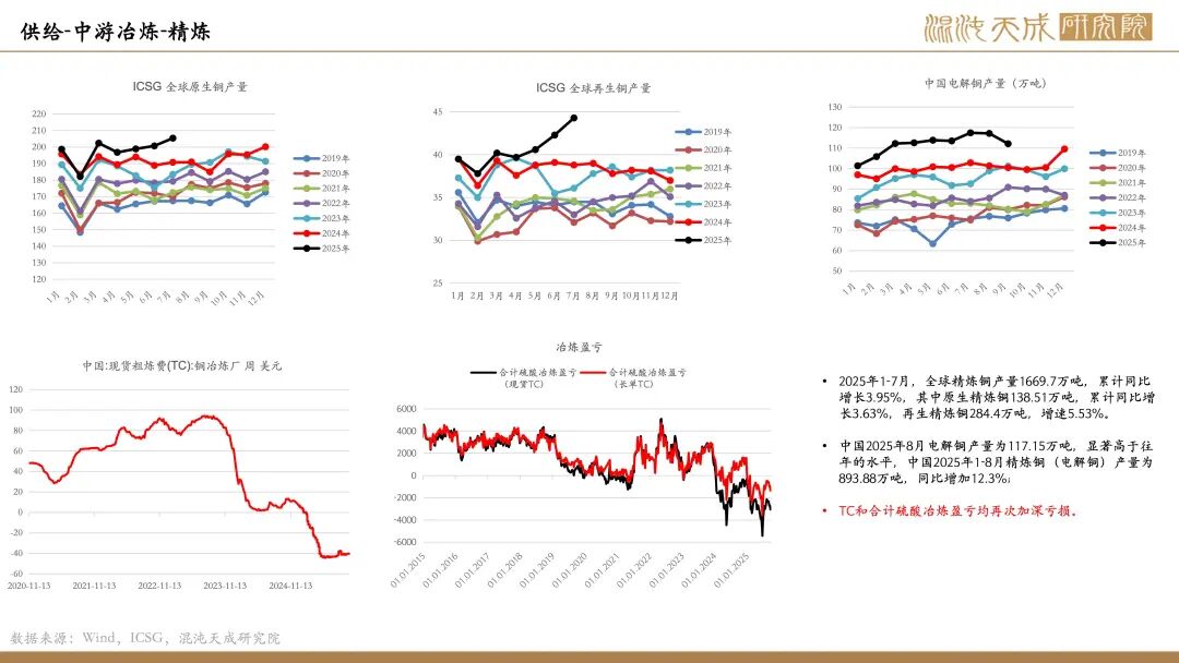 矿端干扰:自由港迈克墨伦公司官网公布称,9月8日在印尼Grasberg Block Cave矿发生的泥浆溃涌事故中,两名员工不幸身亡,目前仍在全力搜救五名失踪人员。事故导致约80万吨湿料瞬间涌入井下多个作业层,矿区自当日已暂停作业。公司预计2025年底完成事故调查,并将三季度铜销量预估下调4%,金销量下调6%。该公司2026年的产量可能比此前估计的17亿磅铜(77万吨)和160万盎司黄金低约35%。(铜产量下降量约为27万吨,约为原生铜产量占比的1.2%);这存在较大的供应扰动。