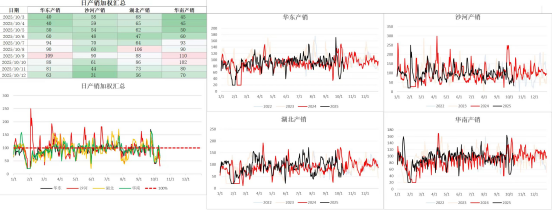 短期需求受天气压制,国庆假期期间北方连续阴雨天气导致企业出货受阻,主流地区产销率持续低迷,全国深加工样本企业订单天数均值11.0天,环比+4.9%,同比-19.0%。深加工持有订单多数仍集中在7天附近居多,增量仍以工程订单为主,工程订单排期15-30天集中,部分60天,需求改善幅度有限。
