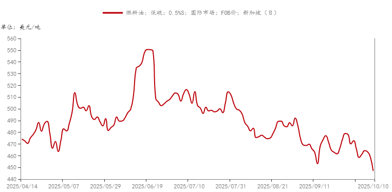(3)国际市场端:尽管0.5%低硫燃料油的东西方套利窗口在近几周基本处于关闭状态,但用于调和低硫燃料油的组分油总体流入量持续增加。此外,亚洲秋季炼厂检修并未显著收紧当地供应,新加坡低硫燃料油市场供应充足。新加坡低硫燃料油价格持续下跌。