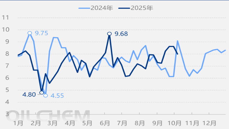 总体来看,季节性旺季成色不足,尽管处于“银十”传统旺季,但2025年玻璃需求呈现旺季不旺特征。