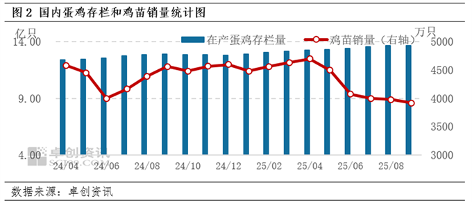鸡苗销量持续减少,后备蛋鸡存栏占比继续压缩。9月后备蛋鸡占比下滑,主要受到鸡苗销量影响。2025年蛋鸡鸡苗销量呈先增后减趋势,其中1-4月鸡苗销量呈增加趋势,5-9月鸡苗销量开启下行通道,鸡苗销量持续下滑,9月鸡苗销量环比跌幅超过1.50%,导致后备蛋鸡群体中新增量小于减少量,因此9月后备蛋鸡存栏占比呈压缩局面,占比环比减少0.26个百分点。