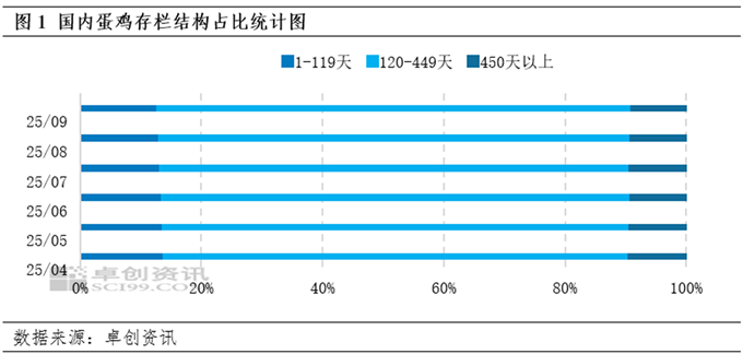 如图1所示,根据卓创资讯监测数据显示,2025年9月全国主产区蛋鸡存栏结构继续呈两端减少,中间增加变化趋势。其中120日龄以下后备蛋鸡以及450日龄以上待出栏老母鸡存栏占比均下降,仅120-450日龄主产蛋鸡占比进一步提升。鸡苗销量以及老母鸡出栏节奏是导致蛋鸡存栏结构发生变化的主要原因。