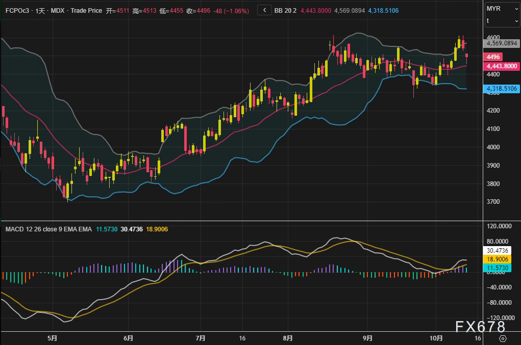 汇通财经APP讯——周一(10月13日),马来西亚衍生品交易所棕榈油主力合约收跌1.06%,报4496林吉特/吨,延续前一日弱势。日内价格在技术面承压于布林带上轨4569点附近,MACD指标红柱收缩,显示短期动能有所减弱。市场在供应压力与出口数据的多空交织中,显露出谨慎姿态。