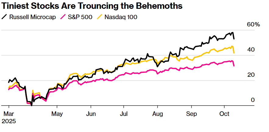自四月以来,这一微盘股基准一直轻松跑赢美股大市,其涨势与人工智能相关的热门个股非常相似——尽管华尔街分析师们已开始担心该群体的历史高位估值。微盘股群体的强势表明,围绕股市从四月初因关税引发的下跌中复苏的狂热,正把投资者吸引向市场最具投机色彩的角落。
