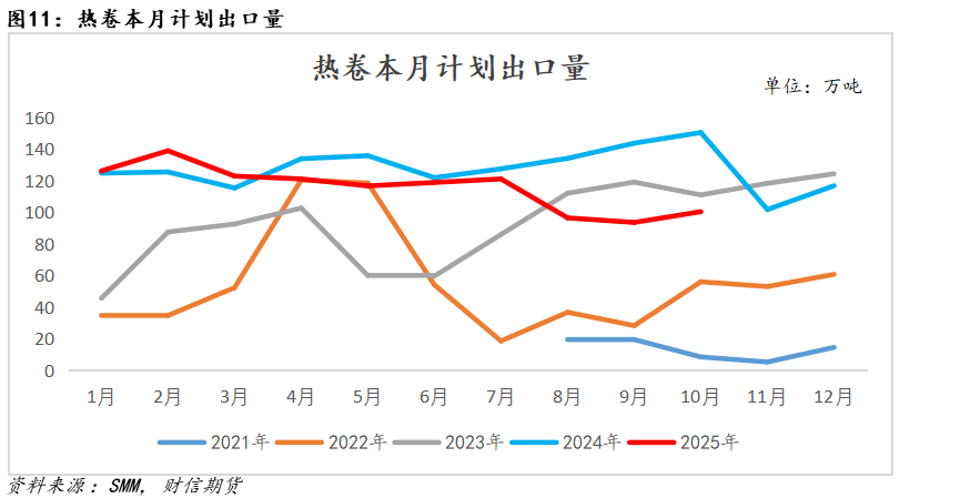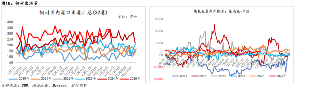 从钢材直接出口角度来看,钢材出港量环比走弱,但以板材为代表的钢材出口动能尚存,短期钢材出口量或维持弱稳。据SMM,25年第41周,32港钢材出港量为215.8万吨,环比下降114.17万吨(或受节假日影响,周度出港量环比下降较大)。从内外价差来看,截止10月10日,热卷内外价差为172.6元/吨,较节前有所上升。综合内外价差与热卷计划出口量,钢材出口需求或仍有一定的韧性。